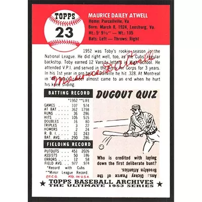 This is a 1991 Topps Archives 1953 Toby Atwell baseball card. The card is #23 and pictures show condition.