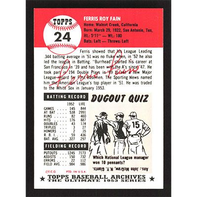 This is a 1991 Topps Archives 1953 Ferris Fain baseball card. The card is #24 and pictures show condition.