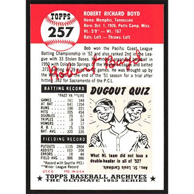 This is a 1991 Topps Archives 1953 Bob Boyd baseball card. The card is #257 and pictures show condition.