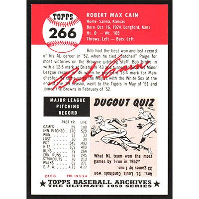This is a 1991 Topps Archives 1953 Bob Cain baseball card. The card is #266 and pictures show condition.