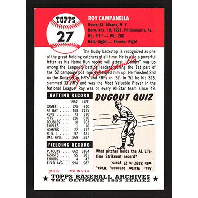 This is a 1991 Topps Archives 1953 Roy Campanella baseball card. The card is #27 and pictures show condition.