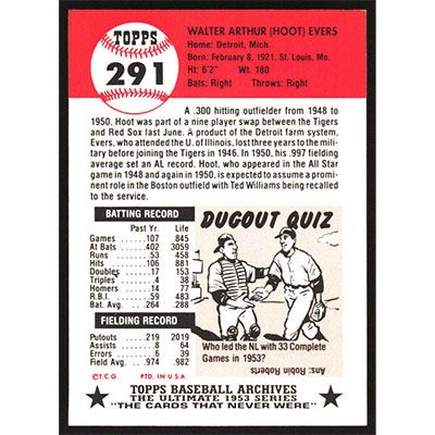 This is a 1991 Topps Archives 1953 Hoot Evers baseball card. The card is #291 and pictures show condition.