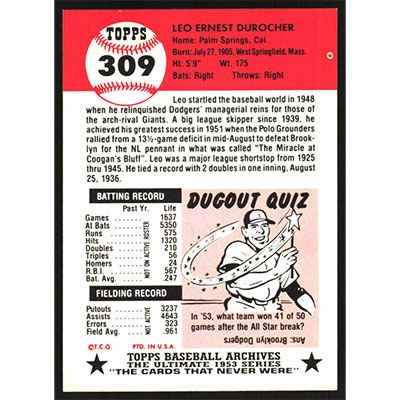 This is a 1991 Topps Archives 1953 Leo Durocher baseball card. The card is #309 and pictures show condition.