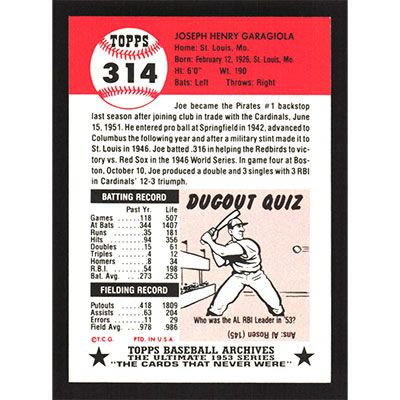 This is a 1991 Topps Archives 1953 Joe Garagiola baseball card. The card is #314 and pictures show condition.