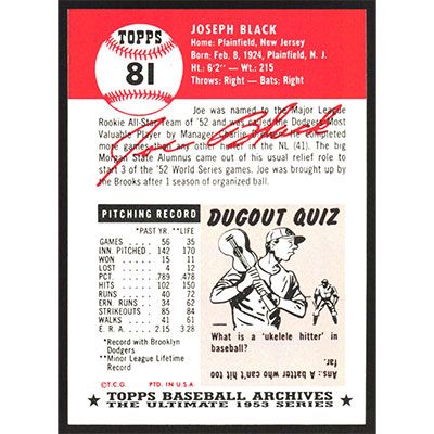 This is a 1991 Topps Archives 1953 Joe Black baseball card. The card is #81 and pictures show condition.