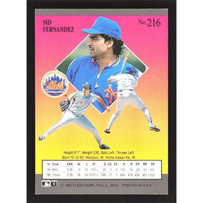 This is a 1991 Ultra Sid Fernandez baseball card. The card is #216 and pictures show condition.