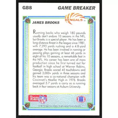 This is a 1991 Upper Deck Game Breaker Holograms James Brooks football card. The card is #GB8 and pictures show condition.