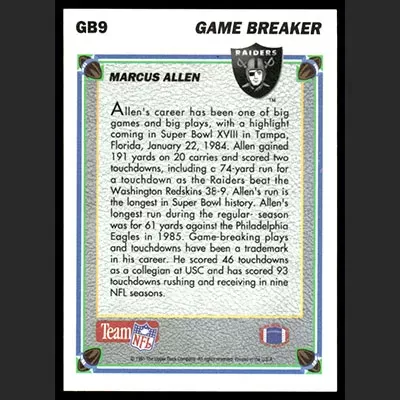 This is a 1991 Upper Deck Game Breaker Holograms Marcus Allen football card. The card is #GB9 and is in NM-MT condition.