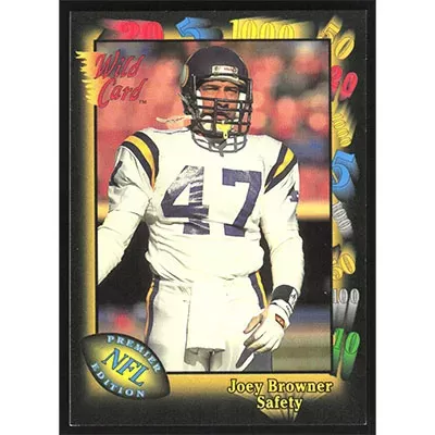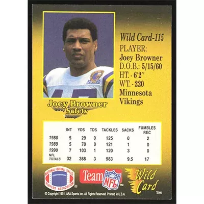 This is a 1991 Wild Card Joey Browner football card. The card is #115 and pictures show condition.