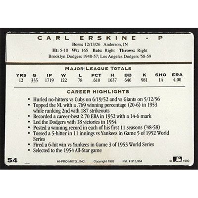 This is a 1992 Action Packed All-Star Gallery Carl Erskine baseball card. The card is #54 and pictures show condition.