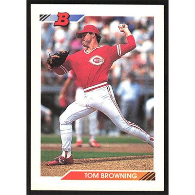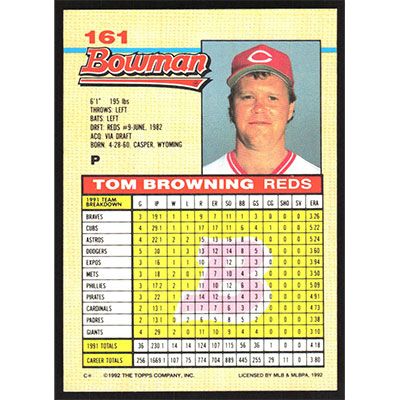 This is a 1992 Bowman Tom Browning baseball card. The card is #161 and pictures show condition.