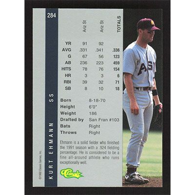 This is a 1992 Classic Four Sport Kurt Ehmann baseball card. The card is #284 and pictures show condition.