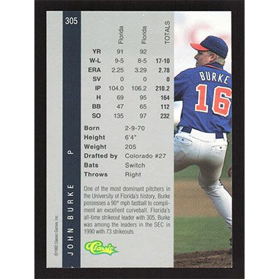 This is a 1992 Classic Four Sport John Burke baseball card. The card is #305 and pictures show condition.