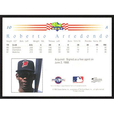 This is a 1992 Classic/Best Roberto Arredondo baseball card. The card is #10 and pictures show condition.