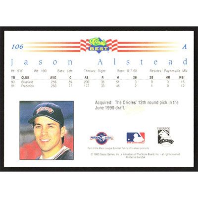 This is a 1992 Classic/Best Jason Alstead baseball card. The card is #106 and pictures show condition.