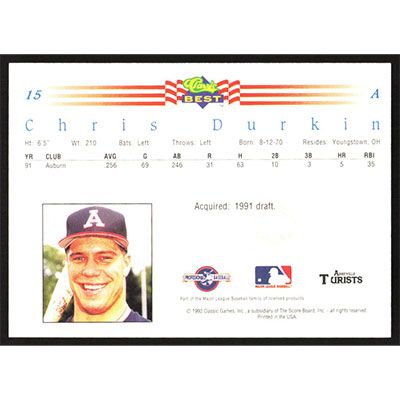 This is a 1992 Classic/Best Chris Durkin baseball card. The card is #15 and pictures show condition.