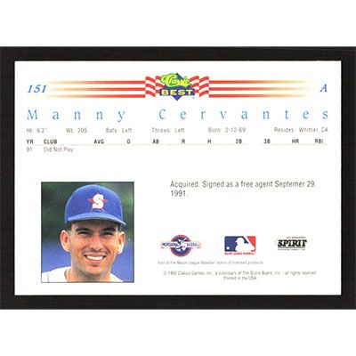 This is a 1992 Classic/Best Manny Cervantes baseball card. The card is #151 and pictures show condition.
