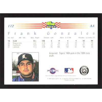 This is a 1992 Classic/Best Frank Gonzales baseball card. The card is #172 and pictures show condition.