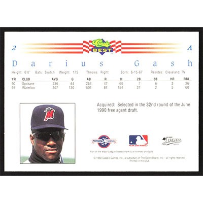 This is a 1992 Classic/Best Darius Gash baseball card. The card is #2 and pictures show condition.
