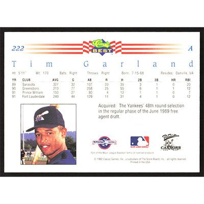 This is a 1992 Classic/Best Tim Garland baseball card. The card is #222 and pictures show condition.