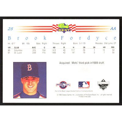 This is a 1992 Classic/Best Brook Fordyce baseball card. The card is #25 and pictures show condition.