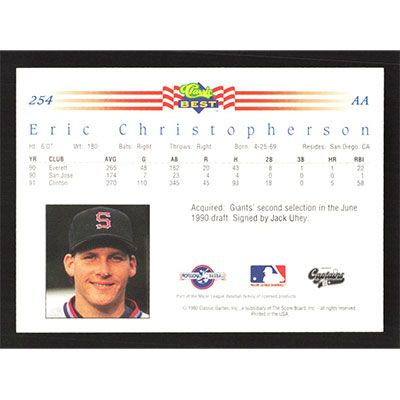 This is a 1992 Classic/Best Eric Christopherson baseball card. The card is #254 and pictures show condition.