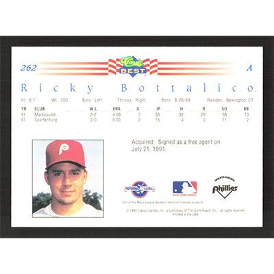 This is a 1992 Classic/Best Ricky Bottalico baseball card. The card is #262 and pictures show condition.