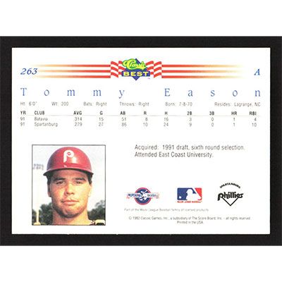 This is a 1992 Classic/Best Tommy Eason baseball card. The card is #263 and pictures show condition.