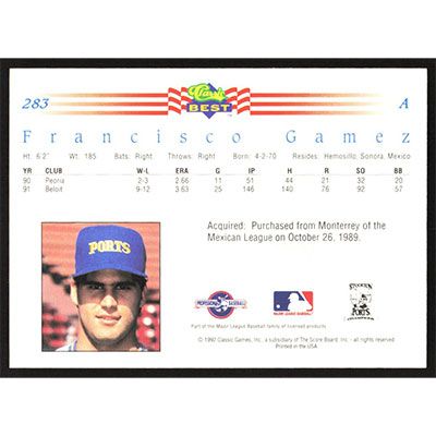 This is a 1992 Classic/Best Francisco Gamez baseball card. The card is #283 and pictures show condition.