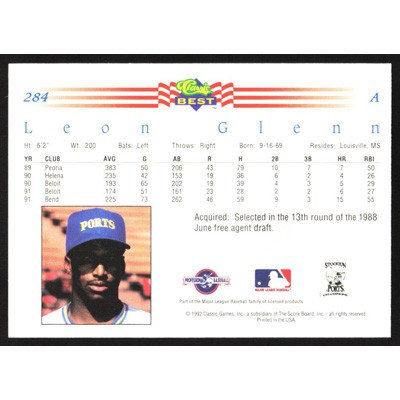 This is a 1992 Classic/Best Leon Glenn baseball card. The card is #284 and pictures show condition.