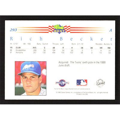 This is a 1992 Classic/Best Rich Becker baseball card. The card is #293 and pictures show condition.
