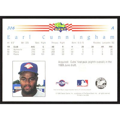 This is a 1992 Classic/Best Earl Cunningham baseball card. The card is #316 and pictures show condition.