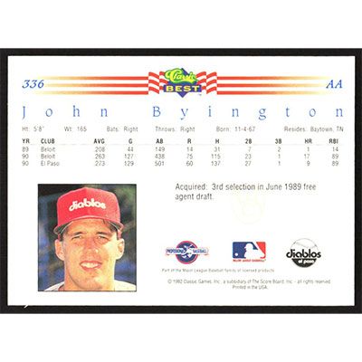 This is a 1992 Classic/Best John Byington baseball card. The card is #336 and pictures show condition.