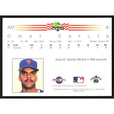 This is a 1992 Classic/Best Omar Garcia baseball card. The card is #337 and pictures show condition.