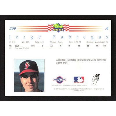 This is a 1992 Classic/Best Jorge Fabregas baseball card. The card is #359 and pictures show condition.