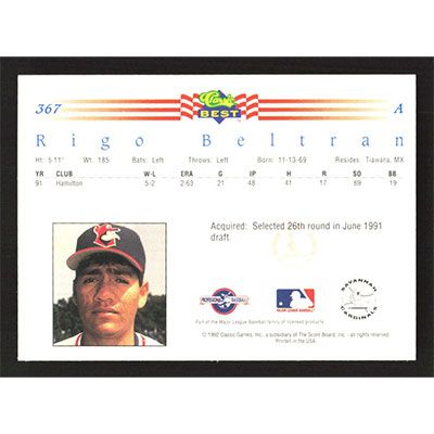 This is a 1992 Classic/Best Rigo Beltran baseball card. The card is #367 and pictures show condition.