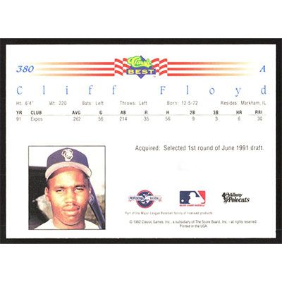 This is a 1992 Classic/Best Cliff Floyd baseball card. The card is #380 and pictures show condition.