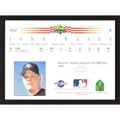 This is a 1992 Classic/Best John Burke baseball card. The card is #412 and pictures show condition.