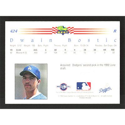 This is a 1992 Classic/Best Dwain Bostic baseball card. The card is #424 and pictures show condition.