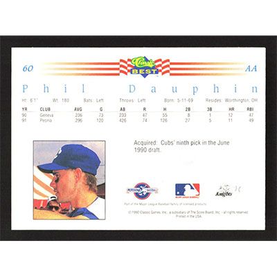 This is a 1992 Classic/Best Phil Dauphin baseball card. The card is #60 and pictures show condition.