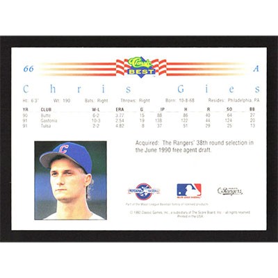 This is a 1992 Classic/Best Chris Gies baseball card. The card is #66 and pictures show condition.
