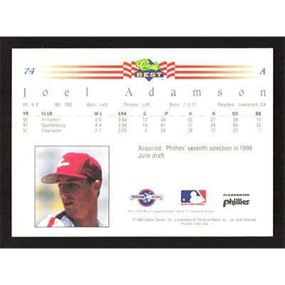 This is a 1992 Classic/Best Joel Adamson baseball card. The card is #74 and pictures show condition.