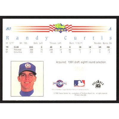 This is a 1992 Classic/Best Randy Curtis baseball card. The card is #80 and pictures show condition.