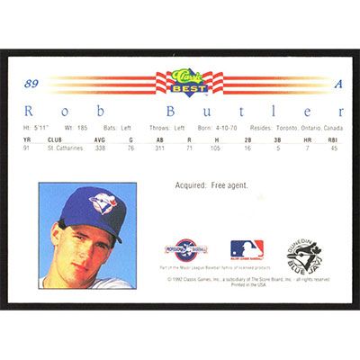 This is a 1992 Classic/Best Rob Butler baseball card. The card is #89 and pictures show condition.
