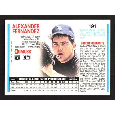 This is a 1992 Donruss Alex Fernandez baseball card. The card is #191 and pictures show condition.