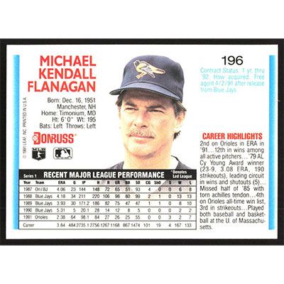 This is a 1992 Donruss Mike Flanagan baseball card. The card is #196 and pictures show condition.