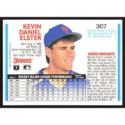 This is a 1992 Donruss Kevin Elster baseball card. The card is #307 and pictures show condition.