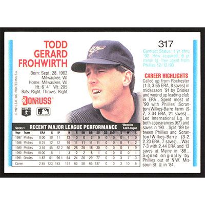 This is a 1992 Donruss Todd Frohwirth baseball card. The card is #317 and pictures show condition.