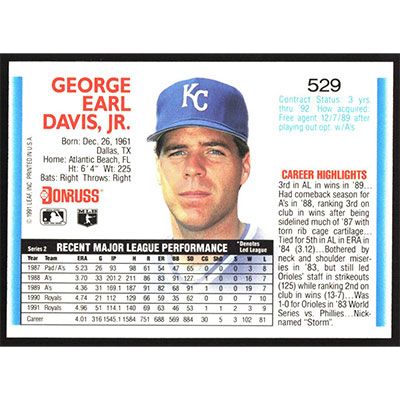This is a 1992 Donruss Storm Davis baseball card. The card is #529 and pictures show condition.