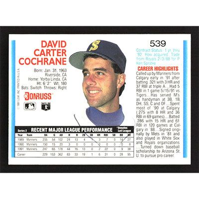 This is a 1992 Donruss Dave Cochrane baseball card. The card is #539 and pictures show condition.